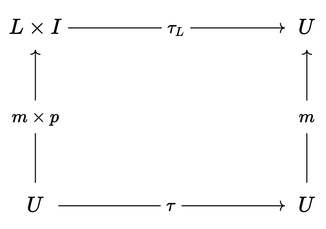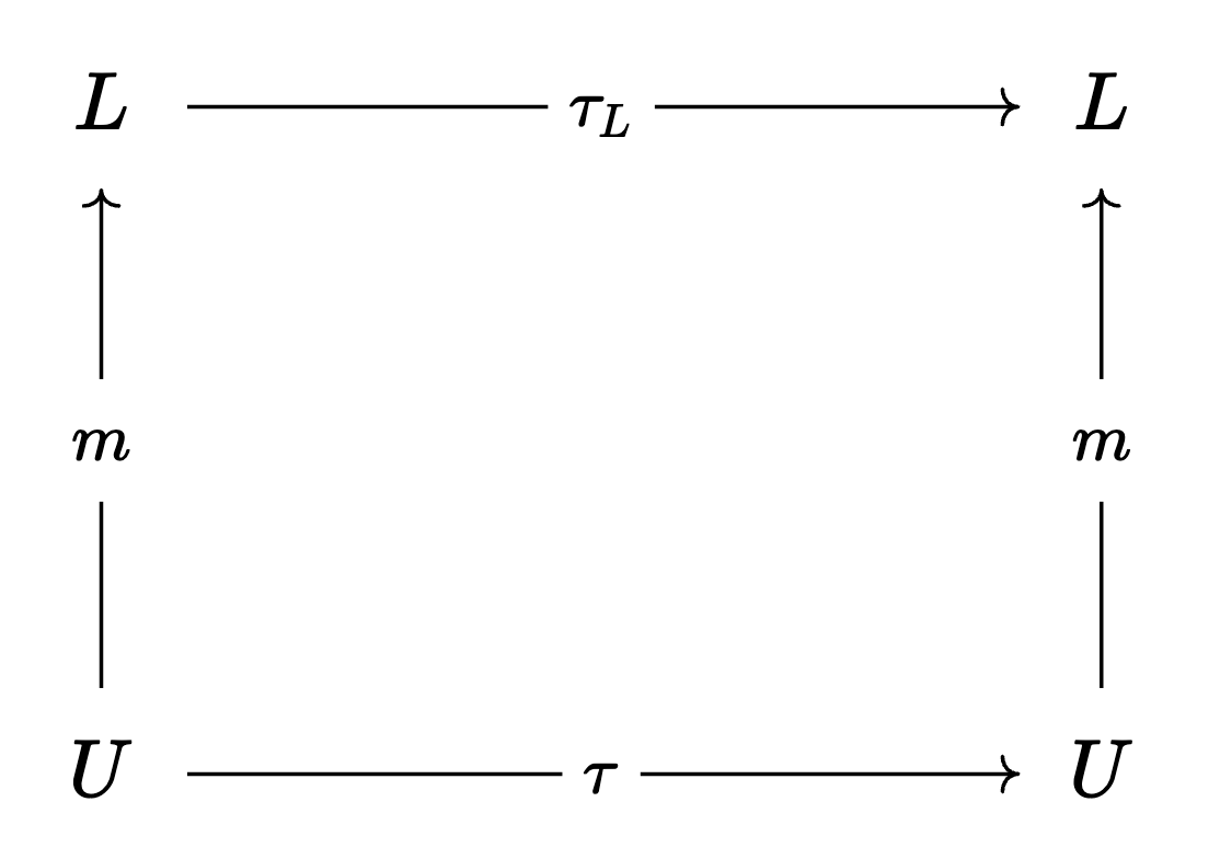 We’ll say that the world realizes an abstract state machine $\tau_L$ if there exists a mapping $m : U \to L$ such that the following commutation relationship holds: